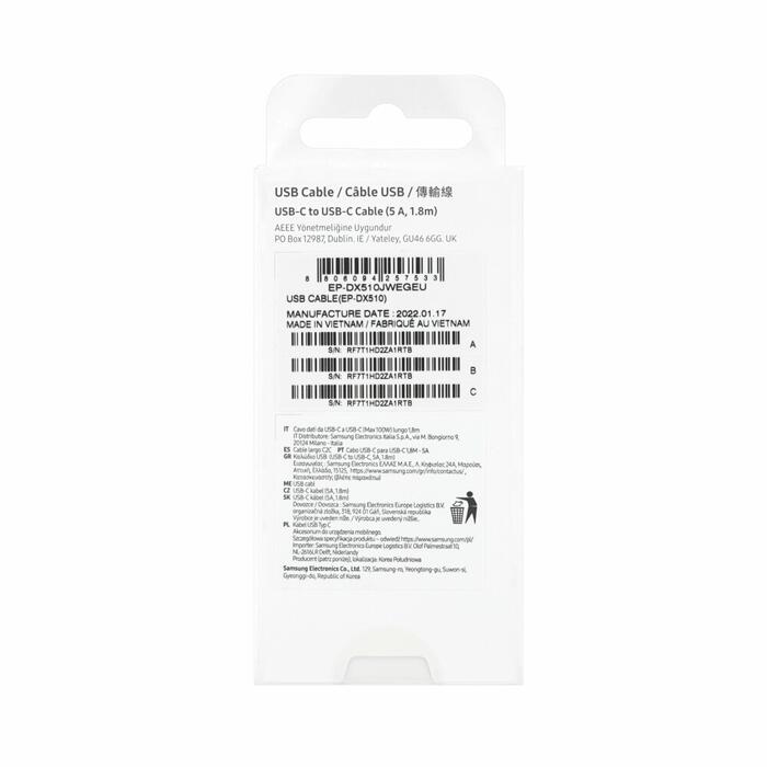 Samsung 1,8 m kabelis (5A), balts EP-DX510JWEGEU