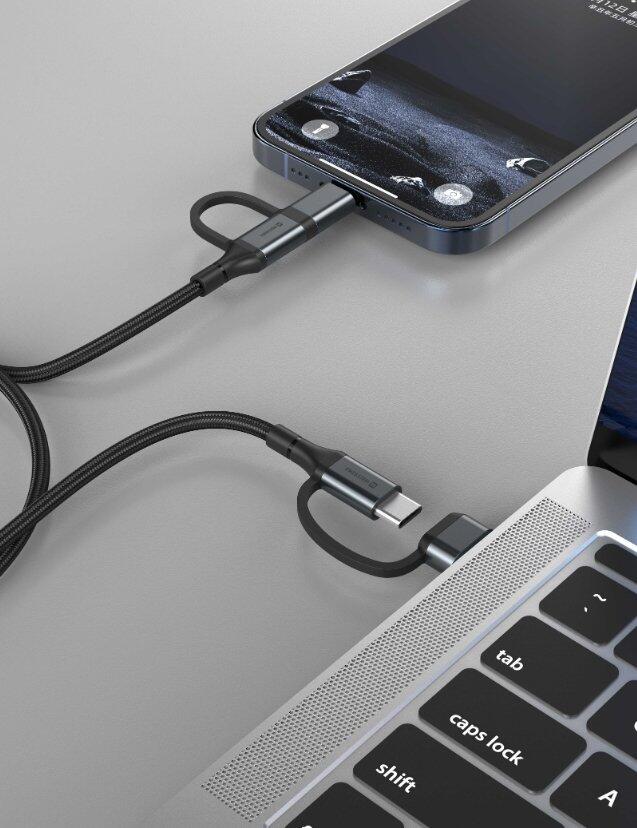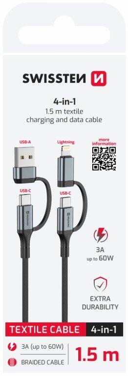 SWISSTEN 4in1 tekstila datu kabelis, 3A, 1,5 m melns, kalpo kā universāls risinājums vairāku ierīču uzlādēšanai bez papildu kabeļu nepieciešamības. Ar USB-C, USB-A un Lightning savienotājiem kabelis piedāvā maksimālu saderību un plašu savienojumu klāstu.