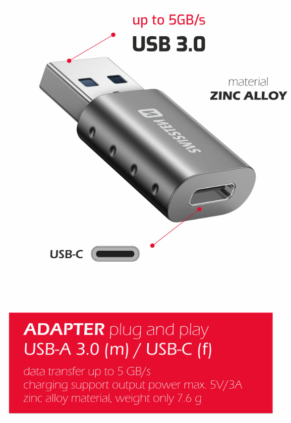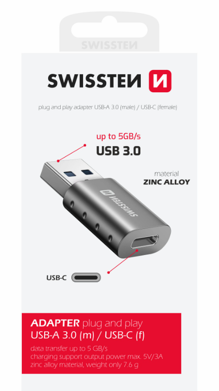 SWISSTEN ADAPTERS USB-A(M) / USB-C(F) tiek izmantots, lai savienotu piederumus ar USB-C savienotāju ar ierīci ar USB-A ieeju. Iepakots SWISSTEN mazumtirdzniecības iepakojumā.