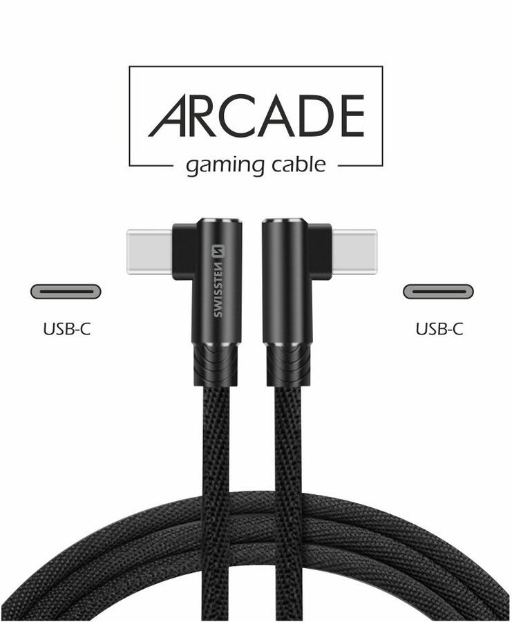 Swissten Arcade datu un uzlādes kabelis ir 1,2 m garš, un tam ir L tipa savienotājs ērtai uzlādēšanai, spēlējot spēles vai skatoties videoklipus. Kabelis ir izturīgs, pārraidot lielāku strāvu (līdz 3A) un var tikt galā ar ātru datu pārraidi 480 Mb / s. Iepakots SWISSTEN mazumtirdzniecības iepakojumā.