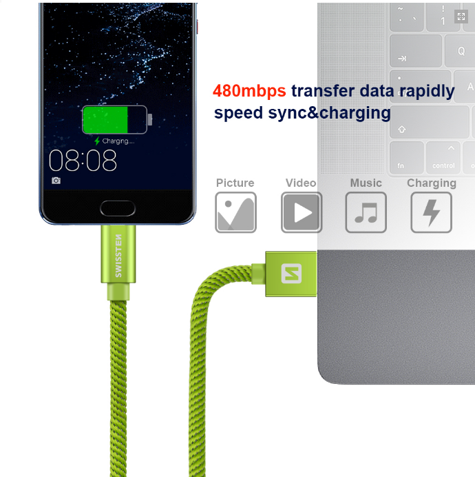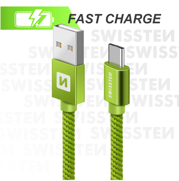 Augstas kvalitātes tekstila datu kabelis USB / USB-C ar garumu 2,0 m. Kabelis ir pastiprināts, lai nodrošinātu lielāku strāvu (līdz 3A) un spēj nodrošināt ātru 480 Mb/s datu pārraidi. Iepakots Swissten mazumtirdzniecības iepakojumā.