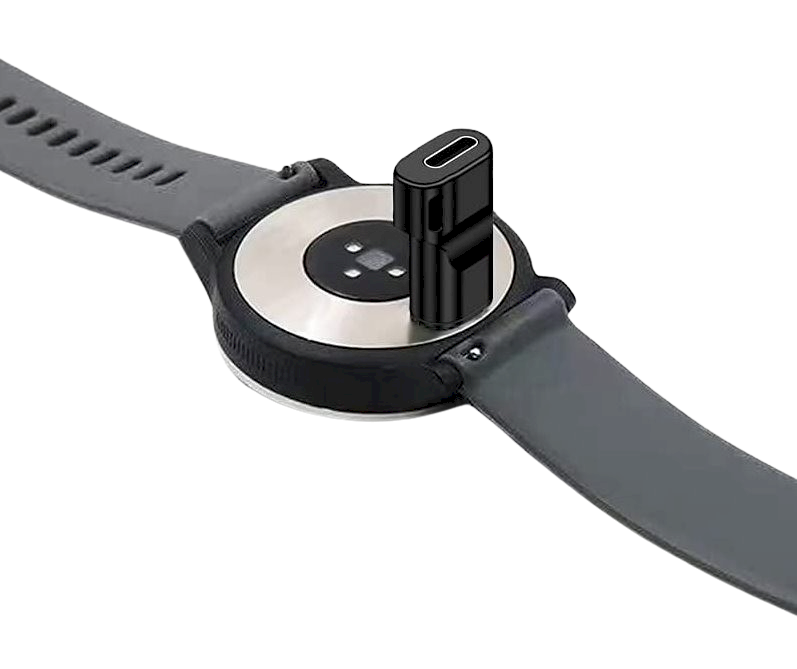 Tacical samazināšana viedo pulksteņu uzlādēšanai, izmantojot jebkuru USB-C kabeli. Vienā pusē tiek pievienots kabelis, bet otrā pusē ir savienotājs viedpulksteņa uzlādēšanai.