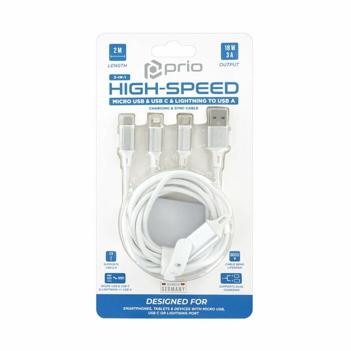 prio 3in1 Micro USB & USB C & Lightning uz USB A kabelis 3A 2m balts