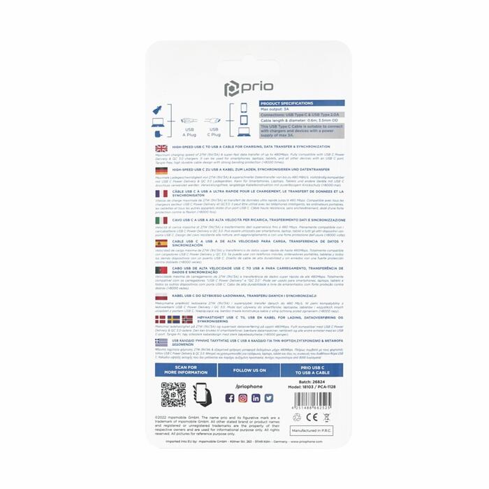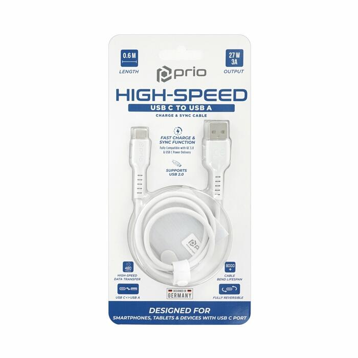 prio ātrgaitas uzlādes un sinhronizācijas USB C uz USB A kabelis 3A 0,6 m, balts