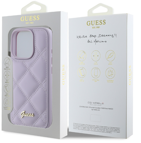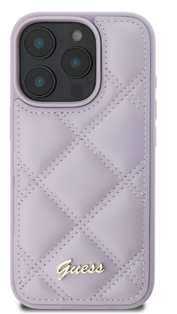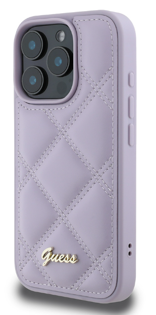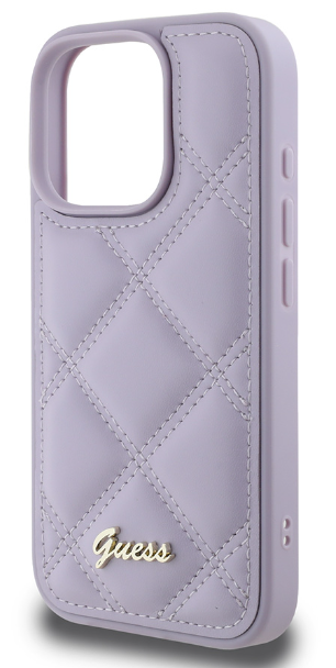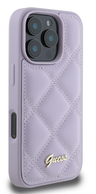 Šis oriģinālais Guess iPhone 16 Pro korpuss ir pārklāts ar vegānu ādu ar polsterējumu, uz kura ir skaistas "dimanta šuves". Korpusu rotā metāla Guess logotips.