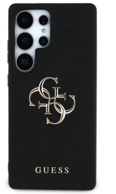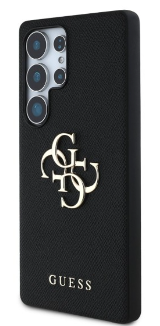 Guess Samsung S25 Ultra Case graudains liels 4G logotips, melns. Stilīgajā Guess futrālī no Big 4G Logo Classic Logo kolekcijas ir eleganta, atpazīstama teksturēta virsma, graudains raksts ar zeltainu GUESS logotipu.