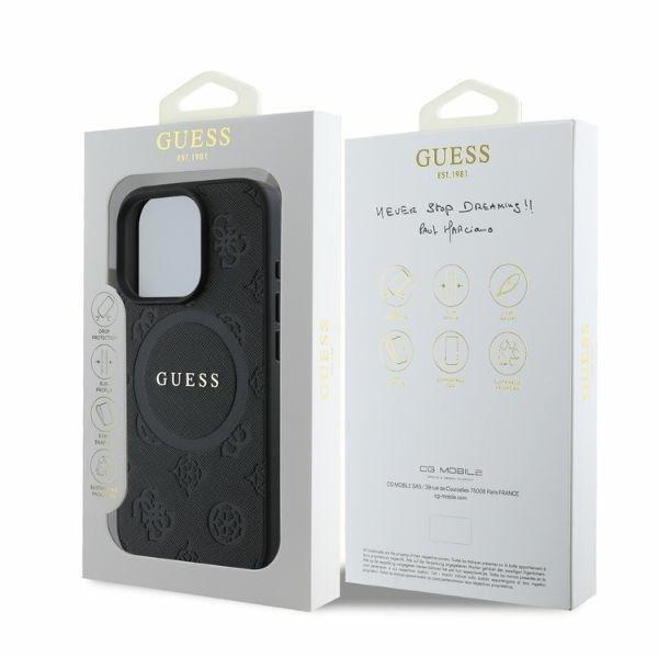 Guess iPhone 16 Pro Case Saffiano Peonija zīmogs MagSafe Black. Guess Saffiano Peony Stamp MagSafe aizmugurējais vāciņš ir ideāls aksesuārs jūsu tālrunim un jūsu apģērbam, apvienojot funkcionalitāti un stilu vienā.