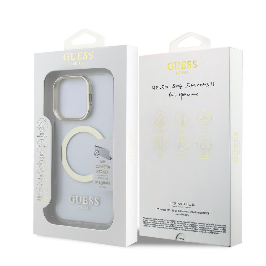 Guess IML Gold Outline Stand Camera Frame MagSafe Case Aizsargapvalks priekš Apple iPhone 16 Pro Max