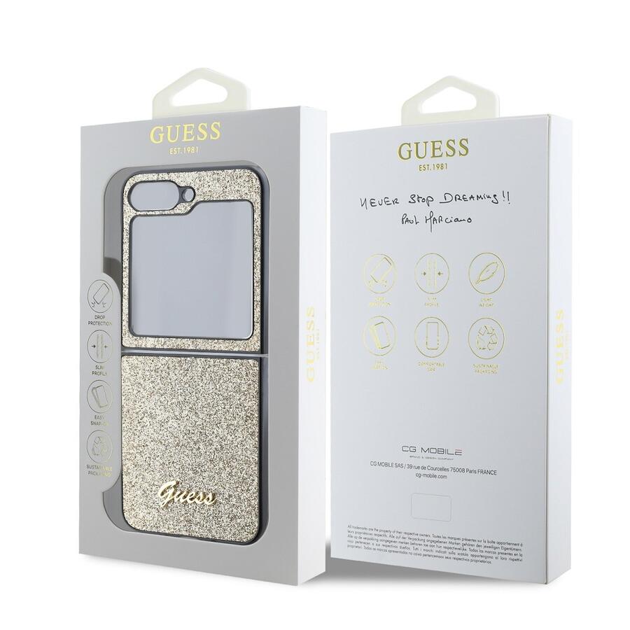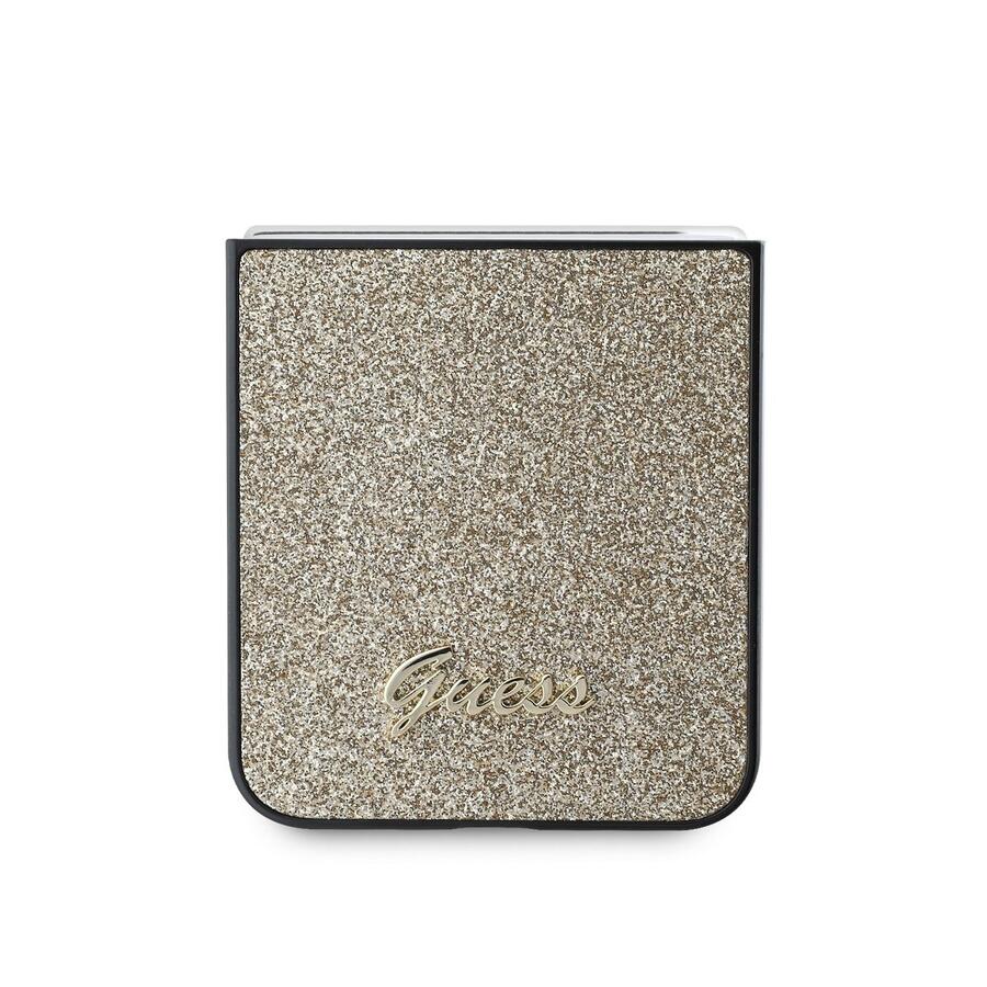 Guess PC/TPU Glitter Flakes Metal Logo Case Aizsargapvalks priekš Samsung Galaxy Z Flip 6/7 FE / zelts