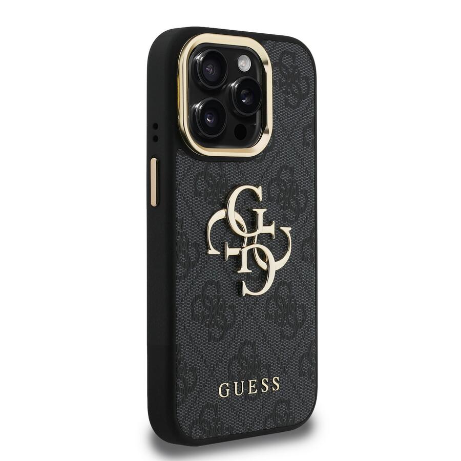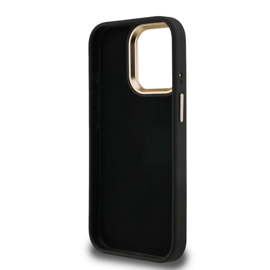 Guess PU 4G Metal Logo Stand Camera Frame Case Aizsargapvalks priekš iPhone 15 Pro / melns