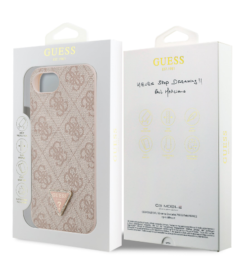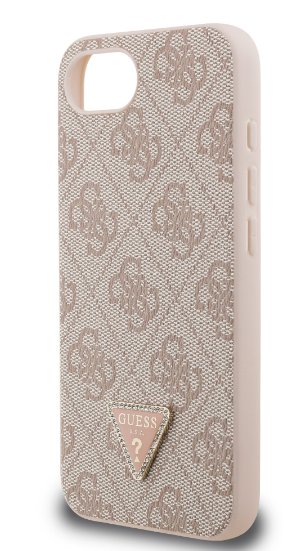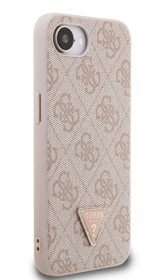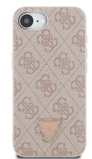 Premium līmeņa aizmugurējā vāciņā Guess PU 4G Strass Triangle Metal Logo ir elegants, raksturīgs 4G raksts, ko papildina zelta trīsstūra GUESS logotips.