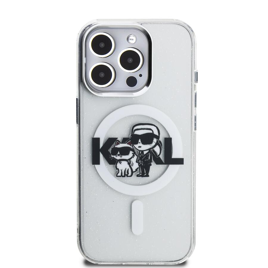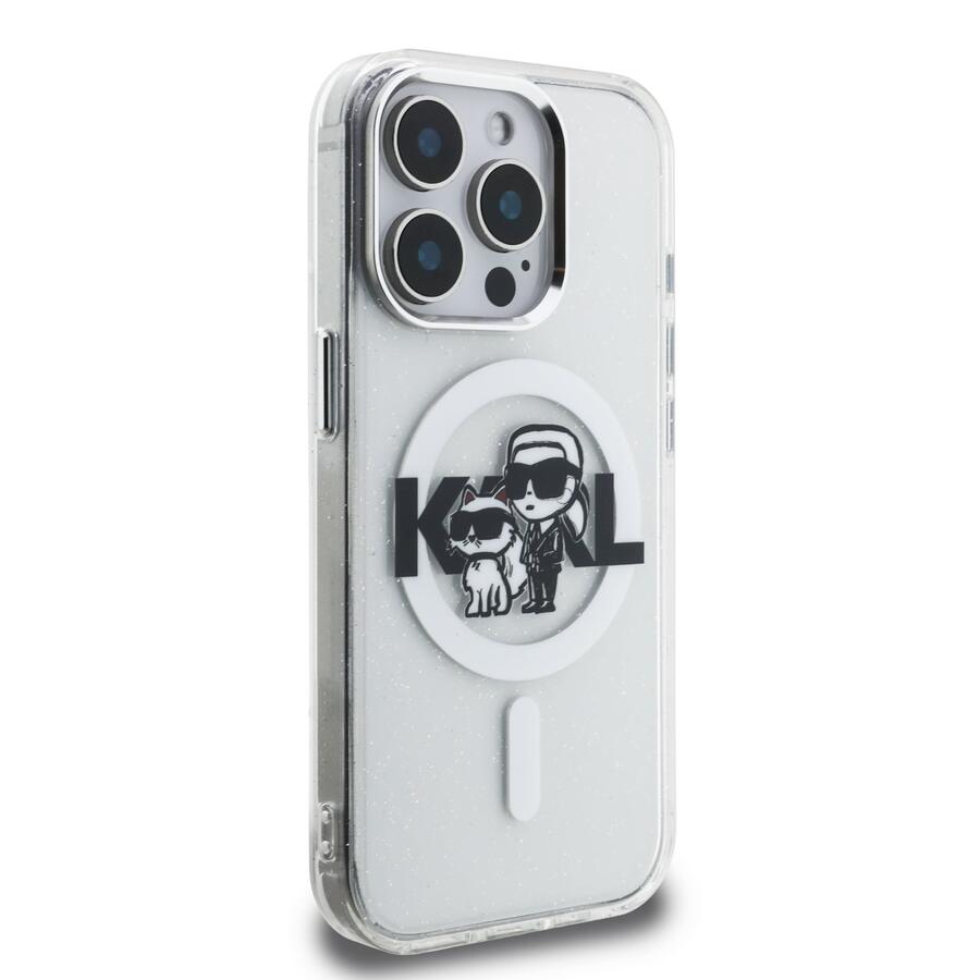 Karl Lagerfeld IML Glitter Karl and Choupette Sketch MagSafe aizmugurējais vāciņš ir ideāls aksesuārs jūsu tālrunim un apģērbam, apvienojot funkcionalitāti un stilu vienā.
