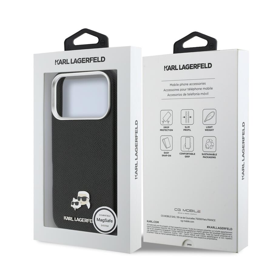 Karl Lagerfeld PU Karl and Choupette Heads Pins MagSafe aizmugurējais vāciņš ir ideāls aksesuārs jūsu tālrunim un apģērbam, apvienojot funkcionalitāti un stilu.