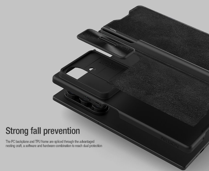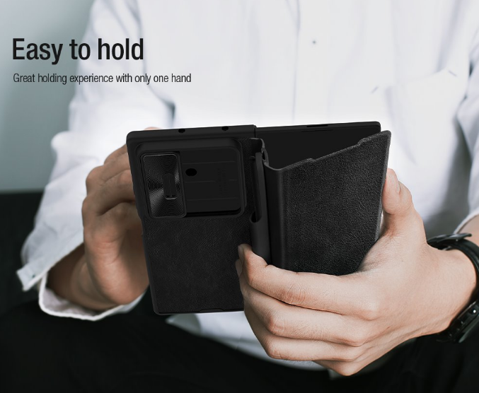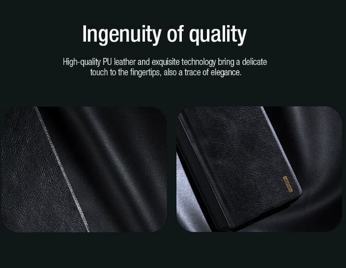 Nillkin QIN Book PRO maciņš ir izgatavots no augstas kvalitātes PU ādas, atveras sāniski kā grāmata, un turklāt, atšķirībā no klasiskā QIN Book, tas ir aprīkots ar bīdāmu kameras objektīva vāciņu.