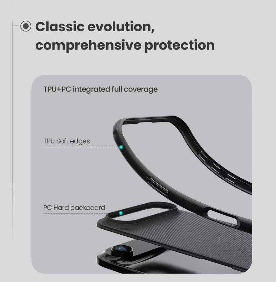 - Materiāls: cieta plastmasa un TPU mīkstās malas