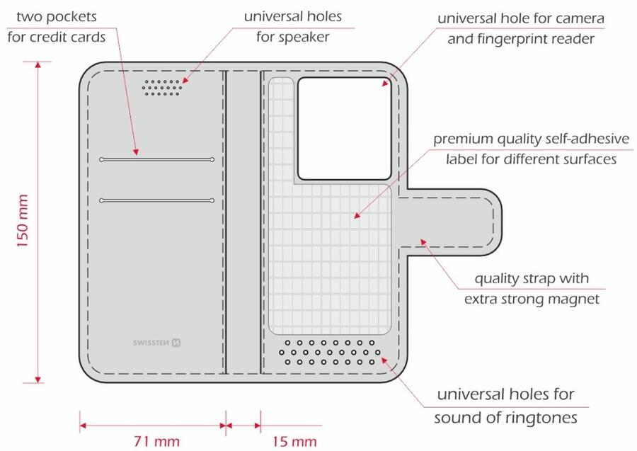 Elegants universāls futrālis ar 3M uzlīmi un magnētisko siksnu. Piemērots tālruņiem ar skārienjūtīgo ekrānu līdz 150 x 71 mm. Iepakots SWISSTEN blistera iepakojumā.
