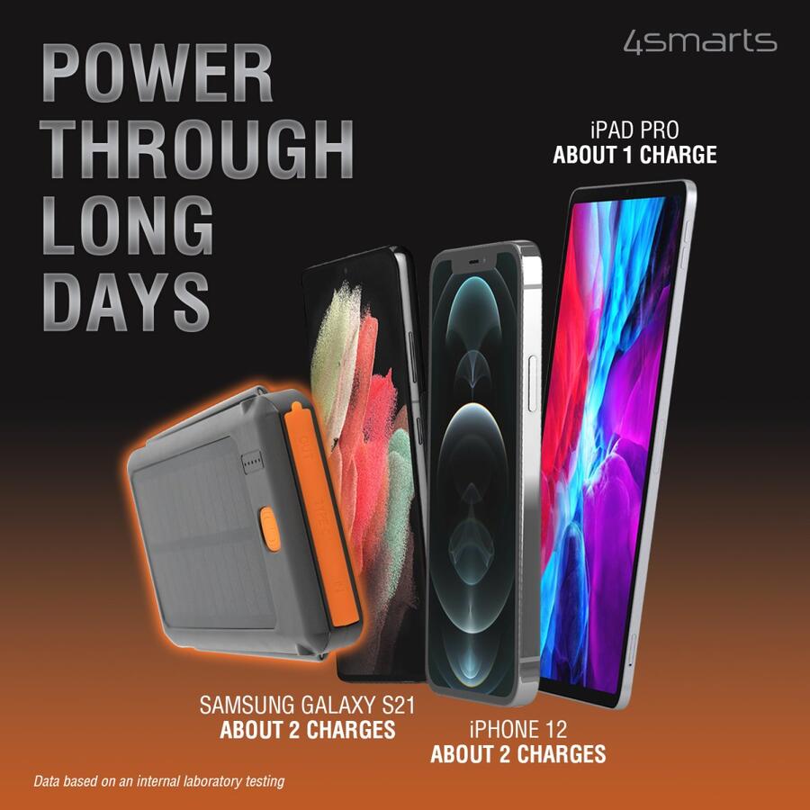 Lūdzu, ņemiet vērā, ka strāvas bankas kompaktā dizaina dēļ saules panelis ir ļoti mazs un tāpēc uzlādējas ļoti lēni. Pat ja jūs pastāvīgi atstājat barošanas akumulatoru saulē, saules baterijas uzlāde aizņem gandrīz 7 reizes ilgāku laiku nekā, izmantojot USB (tātad aptuveni 70 saules stundas!). Tomēr ārkārtas situācijā saules lādiņš uzlādēs viedtālruni pietiekami, lai jūs varētu veikt ātru zvanu pat tuksnesī bez lādētāja.