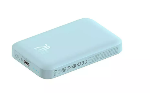 Kompakta un viegla portatīvā uzlādes ierīce ar ietilpību 6000 mAh (~22.2 Wh), nodrošina ātro vadu uzlādi līdz 20 W un magnetisko bezvadu uzlādi līdz 15 W (Qi/MagSafe). Pilnīgas komplektēta — ar USB‑C kabeli, korpuss no PC+ABS plastmasas, zilā krāsā.