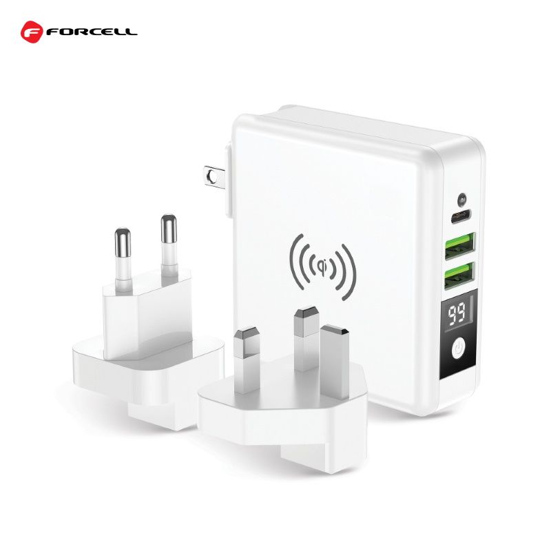 Ideāls ceļojumu komplekts: FORCELL 4in1 multifunkcionāls lādētājs ar Power Bank akumulātoru. Aprīkots ar iebūvētiem portiem: USB, USB-C un strāvas banku. Aprīkots ar Bezvadu Wireless Qi ļinduktīvo lādētāju.