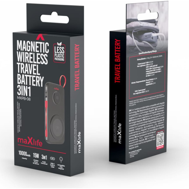 Maxlife MXPB-08 ārējā uzlādes baterija nodrošina ērtu un ātru ierīču uzlādi. Tā ir aprīkota ar magnētisko bezvadu uzlādes funkciju, kas saderīga ar MagSafe tehnoloģiju. Ar 10000 mAh jaudu šī baterija var vairākas reizes uzlādēt viedtālruni vai austiņas. Kompaktais dizains un vieglais svars padara to ideāli piemērotu ceļošanai un ikdienas lietošanai.
