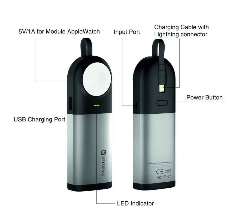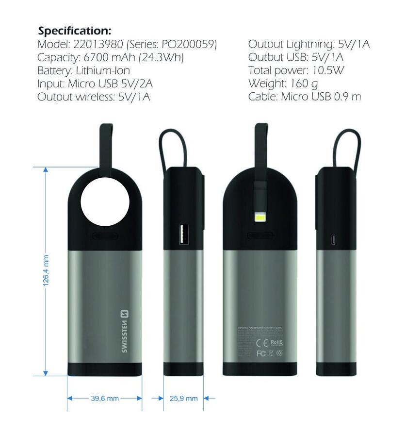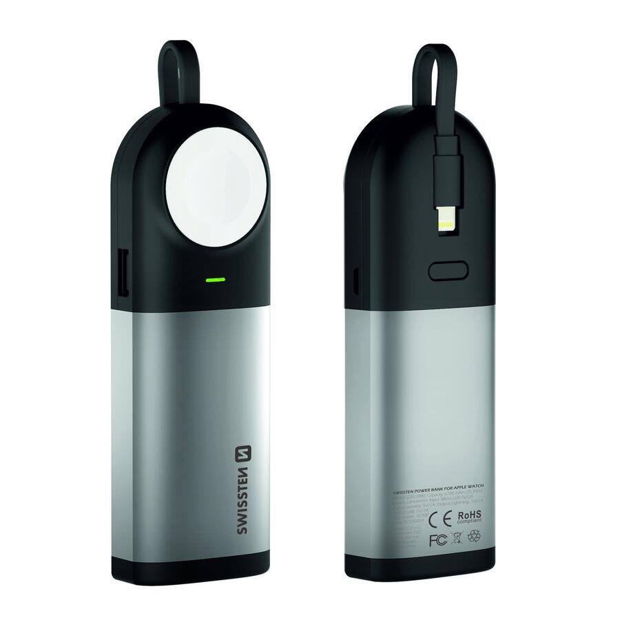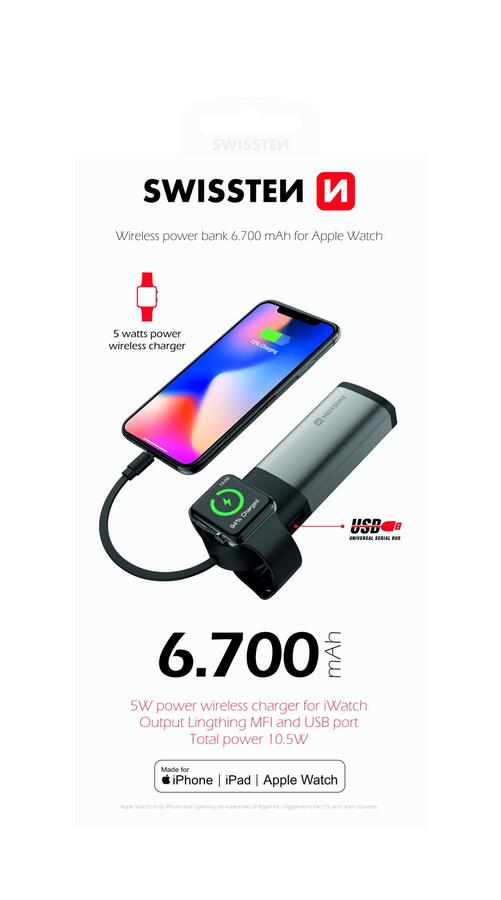Strāvas banka Swissten ar iebūvētu MFi zibens kabeli, bezvadu uzlādes moduli Apple Watch un USB izeju. Barošanas bankas kopējā jauda 6700 mAh. Iepakots Swissten mazumtirdzniecības iepakojumā.