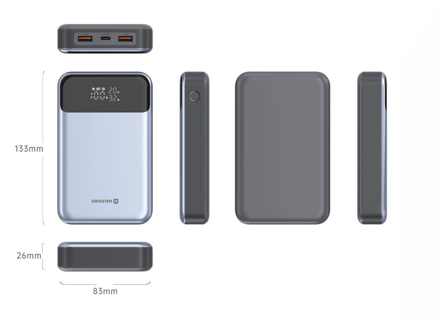 SWISSTEN barošanas bloks ar jaudu 20 000 mAh ar ātrās uzlādes tehnoloģiju, 100 W jaudu un 2 USB-A un 1x USB-C izejām. Iepakots SWISSTEN blisterī.