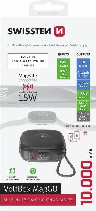 SWISSTEN POWER BANK VOLTBOX MagGO 10000 mAh ir jaudīgs risinājums, kas paredzēts mūsdienu lietotājiem, kuriem vienlaikus jāuzlādē vairākas ierīces. Tam ir integrēti USB-C un Lightning kabeļi, tāpēc jums vairs nav jānēsā papildu kabeļi.