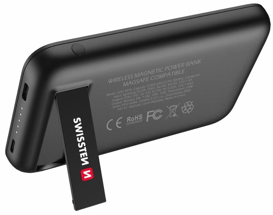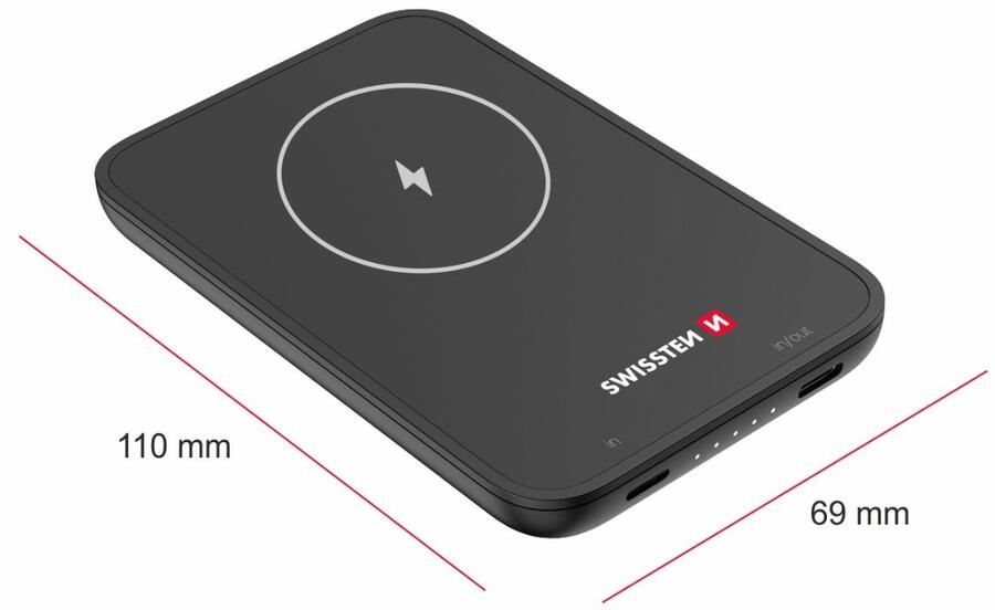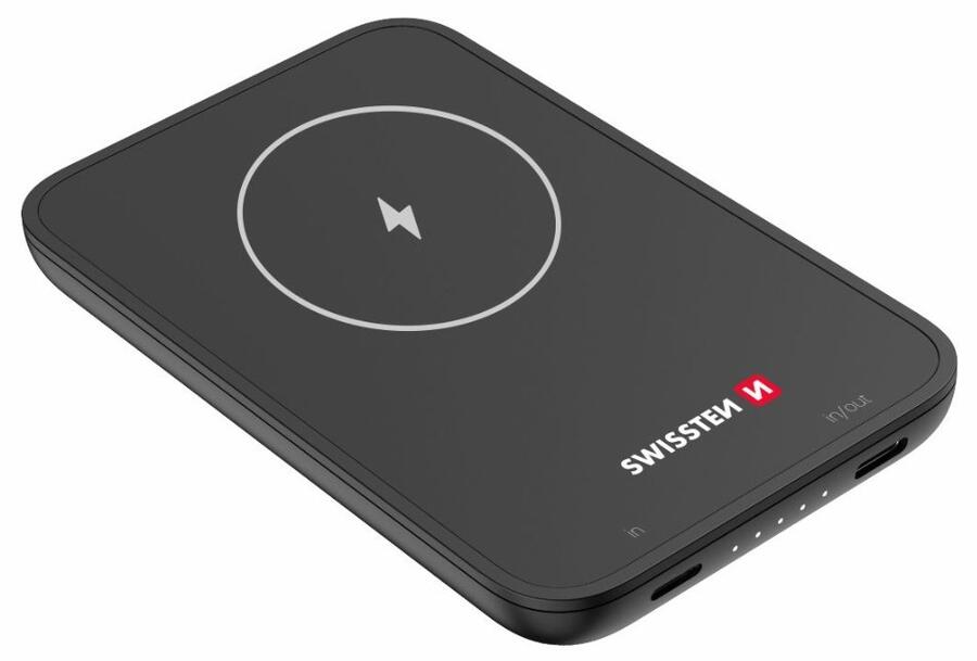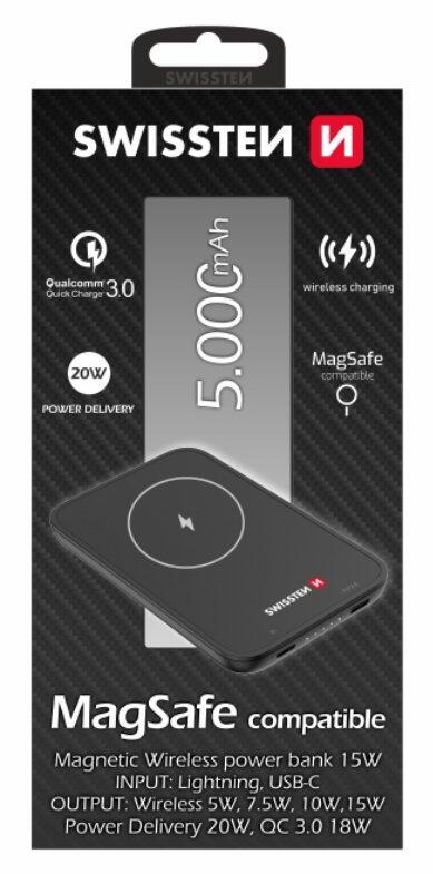 SWISSTEN jaudas banka ar jaudu 5000mAh, ātru PD + QC uzlādi un bezvadu uzlādi ar jaudu līdz 15W (saderīgs ar MagSafe). Iepakots SWISSTEN mazumtirdzniecības iepakojumā.