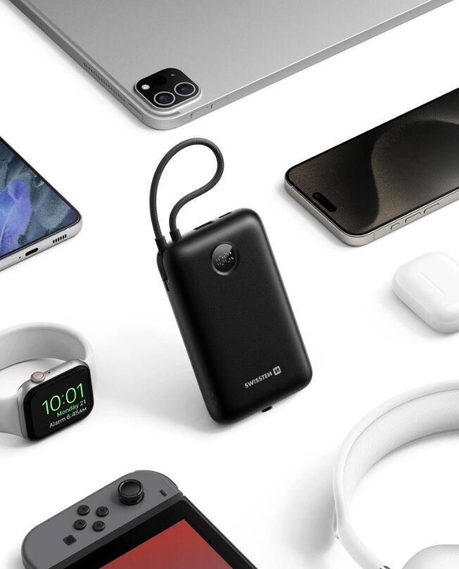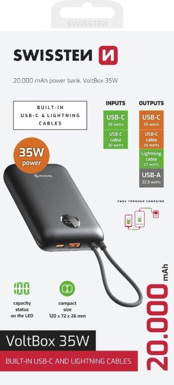 SWISSTEN POWER BANK VOLTBOX 35W 20 000 mAh ir paredzēts mūsdienu lietotājiem, kuri novērtē integrēto USB-C un Lightning kabeļu ērtības. Ar tiem varat ātri un ērti uzlādēt gan Android ierīces, gan iPhone.