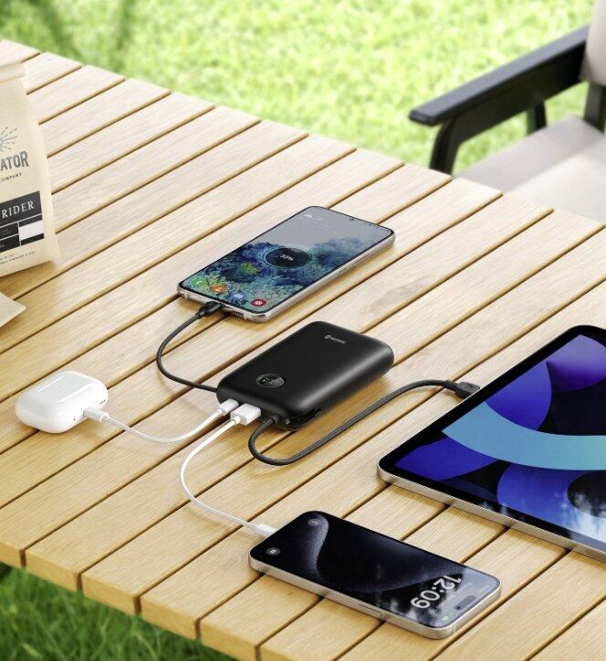 Atbalstot ātru uzlādi, tas nodrošina līdz 35 W izvadi, izmantojot USB-C portu un integrēto kabeli, ļaujot efektīvi uzlādēt viedtālruņus, planšetdatorus un pat mazākus klēpjdatorus. USB-A izeja ar 22,5 W jaudu piedāvā papildu iespēju citas ierīces pievienošanai, lai jūs varētu ērti uzlādēt divas ierīces vienlaikus. Integrētais Lightning kabelis ar jaudu līdz 27 W ir ideāli piemērots Apple ierīču lietotājiem, kuri novērtē ātrumu un ērtības.