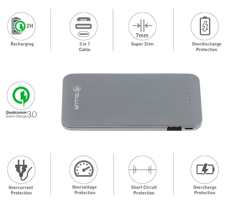 Tellur Power Bank QC 3.0 Fast Charge, 5000mAh, 3in1 gray