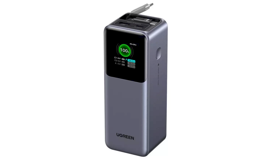 Ugreen pb726 ir augstas veiktspējas portatīvais akumulators viedtālruņu, planšetdatoru, klēpjdatoru un citu usb ierīču uzlādei ceļā. Ierīcei ir ievelkams usb‑c kabelis un papildus usb‑c un usb‑a porti, kas ļauj vienlaikus uzlādēt līdz trim ierīcēm ar kopējo jaudu līdz 165 w. Digitālais tft displejs rāda akumulatora līmeni, spriegumu un jaudu reāllaikā, un aizsardzības sistēma nodrošina drošu darbību. Lielā jauda un ievelkamais kabelis padara to piemērotu jaudīgu ierīču uzlādei.