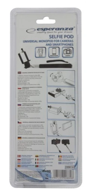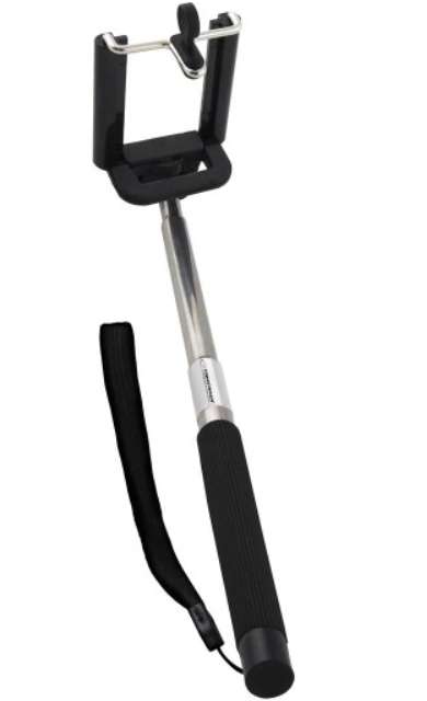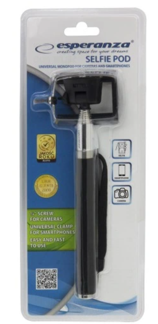 7 segmentu, universāls monopods selfiju uzņemšanai ar kameru vai mobilo telefonu. Tam ir galva ar ¼” skrūvi kameru uzstādīšanai un viedtālruņa turētājs.