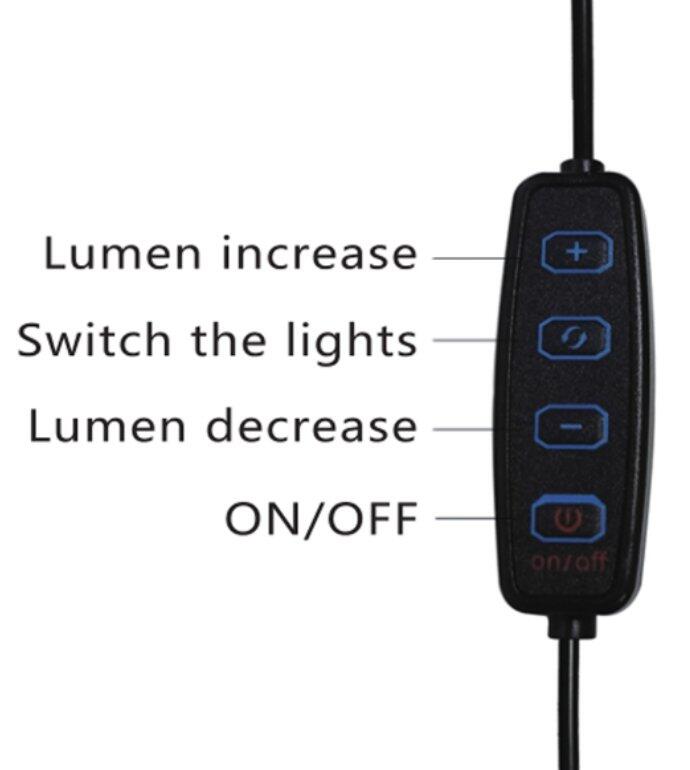 To darbina 5V USB kabelis. Turklāt tam ir vadības panelis, kas atrodas uz kabeļa, no kura mēs varam viegli ieslēgt un izslēgt lampu un mainīt apgaismojuma spilgtumu un krāsu.