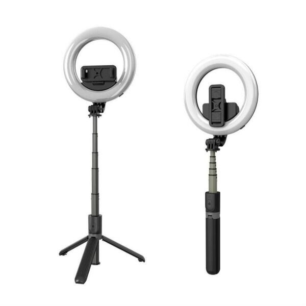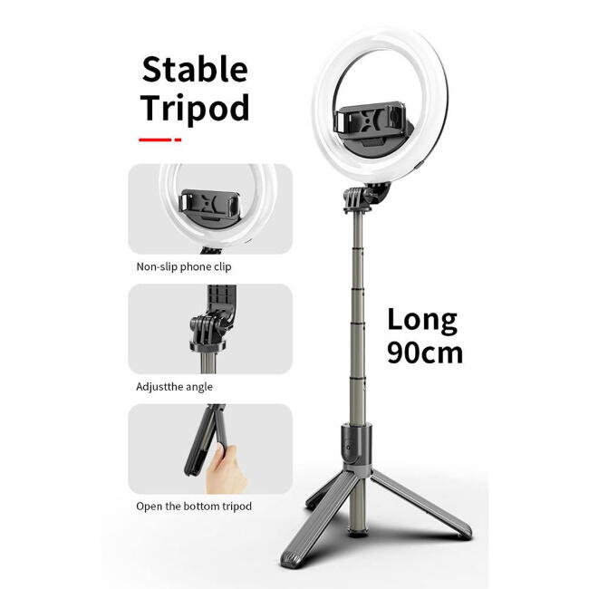 Gredzena gaisma L07 Bluetooth pašbilde tiek uzlādēta no tīkla un darbojas bezsaistē. Tagad jūs varat strādāt ar labāko LED gaismu bez vadu mudžekļa. Vienkārši nofiksējiet viedtālruni turētājā un uzņemiet foršus selfijus visur!