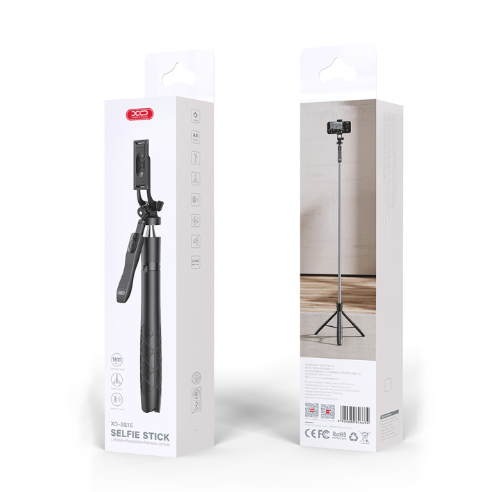 Cieta un estētiski izgatavota XO SS15 selfie Nūja ar ērtu tālruņa turētāju un iebūvētu statīvu. Tālruņa aizvars tiek aktivizēts, izmantojot tālvadības pults pogu, izmantojot Bluetooth savienojumu. Ierīce ir veidota tā, ka salocītā veidā tas aizņem ļoti maz vietas.