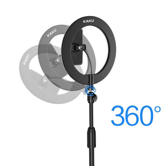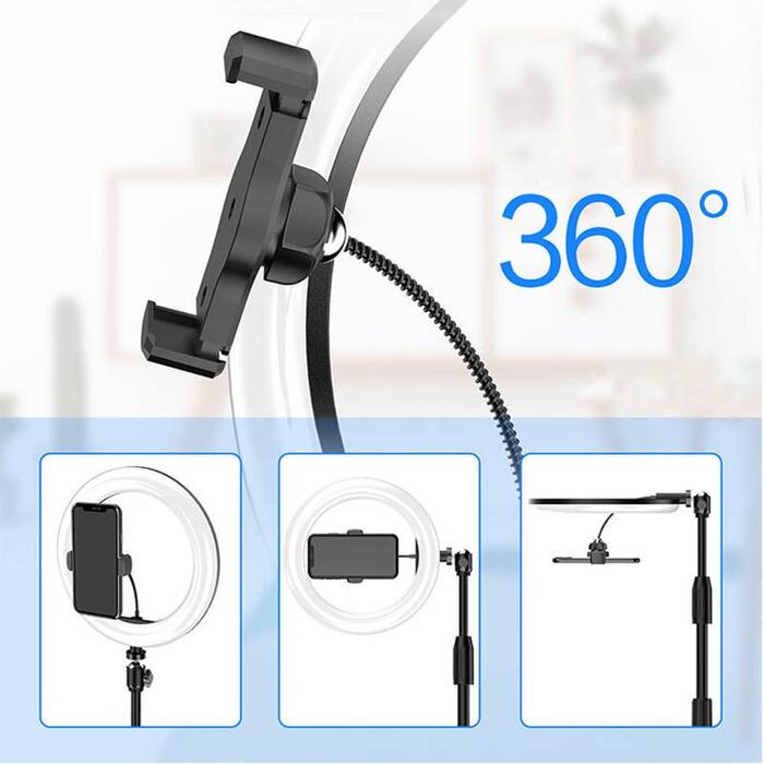 Gredzena luktura centrā ir telefona turētājs. Tam ir elastīgs pagarinājums, pateicoties kuru viedtālruni var novietot daudzos leņķos. Tas ir ļoti noderīgi cilvēkiem, kuri uzņem selfijus (piemēram, uzrādot dekoratīvo kosmētiku), bet arī produktu un klusās dabas fotografēšanai.