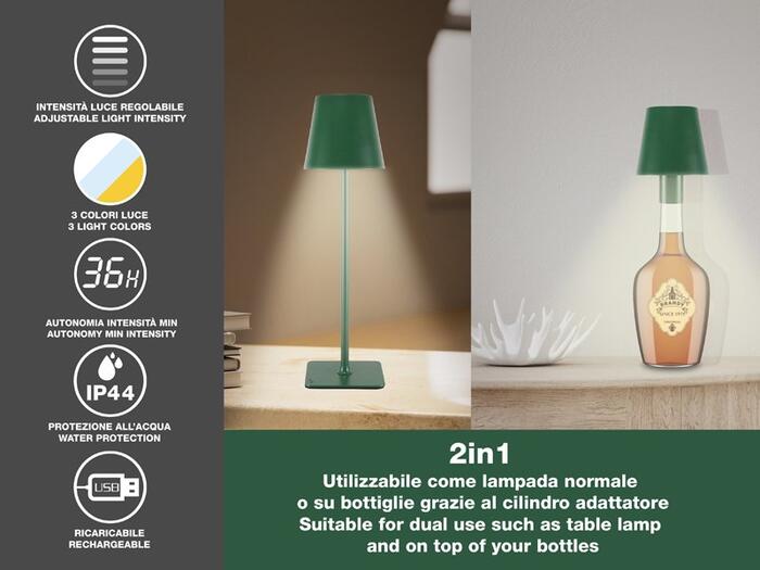 Komplektācijā iekļautais 33 mm pudeles adapteris piedāvā elegantu alternatīvu galda versijai, ļaujot novietot mūsu lampu uz savas iecienītākās pudeles galda centrā.
