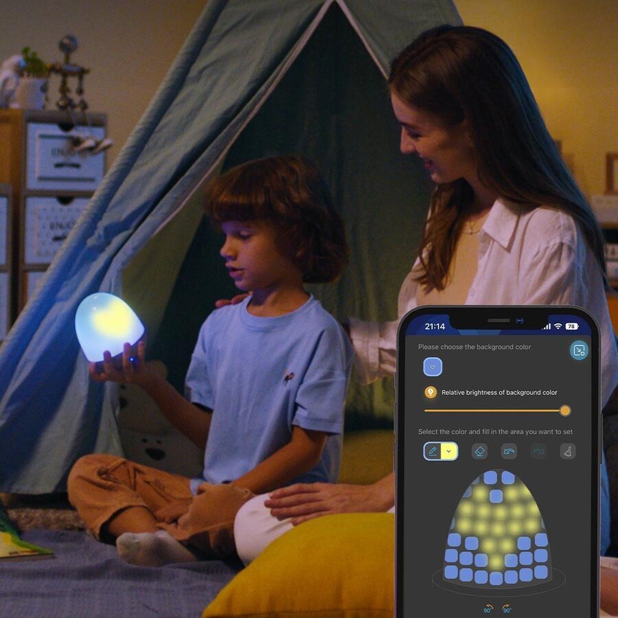 Nakts lampa piedāvā ērtu lietošanu pirms gulētiešanas, pateicoties virknei funkciju, kuras var vadīt, izmantojot viedtālruņa lietotni. Izmantojot lietotni, varat viegli iestatīt taimerus, lai konkrētos laikos ieslēgtu vai izslēgtu lampu , tādējādi atvieglojot konsekventas gulētiešanas rutīnas izveidi sev vai saviem bērniem. Varat arī pielāgot lampas spilgtumu un krāsu temperatūru , nodrošinot savām vajadzībām atbilstošu gaismas daudzumu. Neatkarīgi no tā, vai lasāt grāmatu, gatavojaties gulēt vai vienkārši nepieciešams nedaudz gaismas, lai pārvietotos pa istabu, šo naktslampiņu var pielāgot pēc jūsu vēlmēm. Ar iespēju vadīt lampu no tālruņa