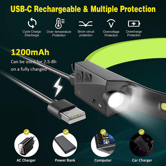 Augstas kvalitātes uzlādējams LED priekšējais lukturis, kas paredzēts vieglam un parocīgam, palīdzot mazināt spiedienu uz galvu. Izmantojot kustības sensora režīmu, varat viegli kontrolēt apgaismojuma režīmu, pārvietojot roku skriešanas, kempinga, pārgājienu, makšķerēšanas, riteņbraukšanas un citu āra aktivitāšu laikā.
