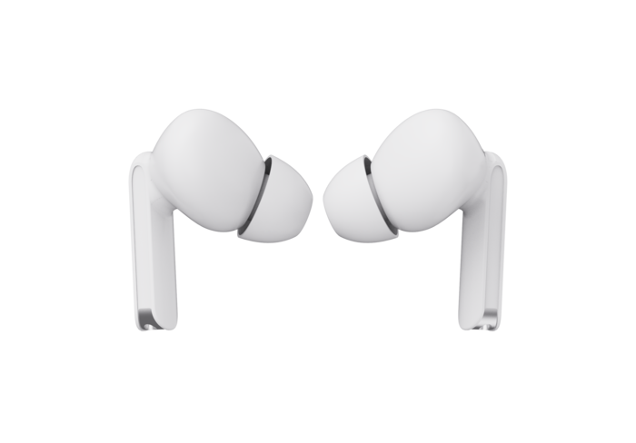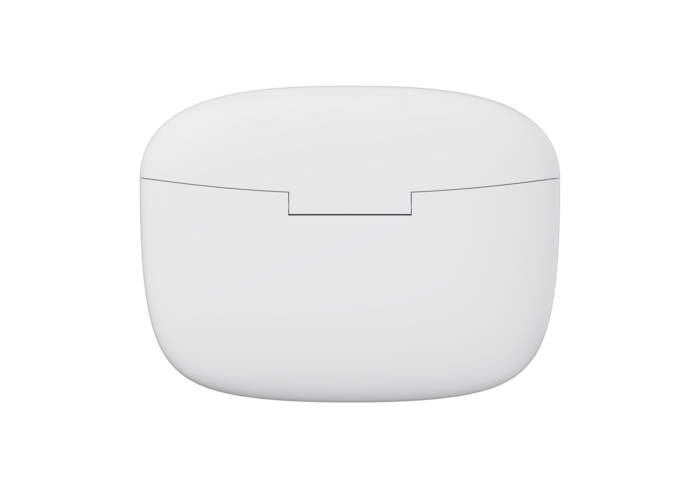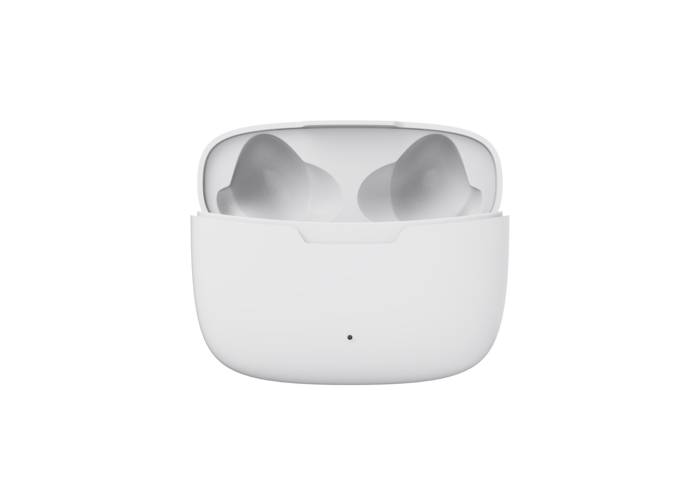 Plastmasas austiņas. Uzlādes futrālis ir izgatavots no izturīgas plastmasas