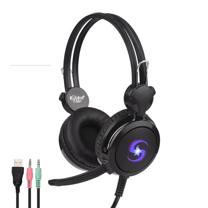 Kubite T-591 Spēļu Austiņas 40m draiveri 1.8m Vads 2x 3.5mm audio/mic + USB Melna