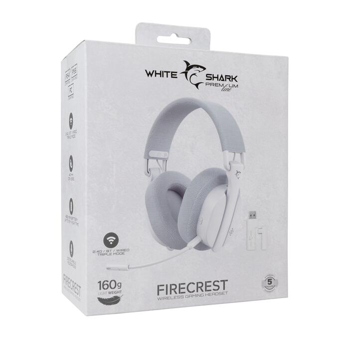 Izbaudiet spēles bez ierobežojumiem ar īpaši vieglajām White Shark FIRECREST bezvadu austiņām, kas sver tikai 160 g.