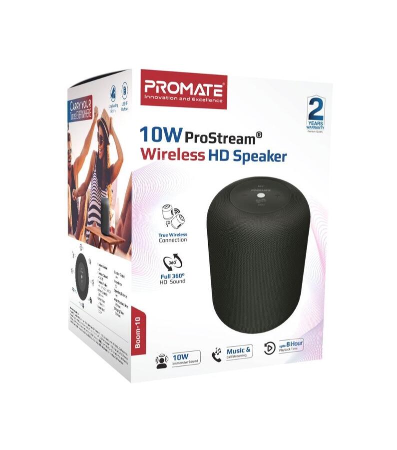 PROMATE Boom-10 ir stilīgs pārnēsājams Bluetooth skaļrunis cilindriskā formā. 10 W skaļas un bagātīgas skaņas, 8 stundu autonomija un ergonomisks korpuss padara to par neatņemamu jebkuras ballītes elementu.