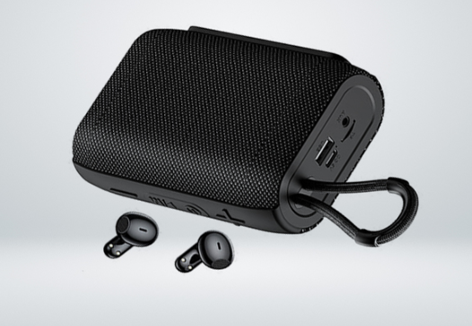 Komplektā ietilpst bezvadu skaļrunis un TWS austiņas. Ierīce izmanto Bluetooth 5.3 un nodrošina stabilu signālu līdz 10 m. turklāt tā piedāvā USB, AUX un TF kartes slotu. Turklāt ērtas pogas padara to viegli lietojamu.