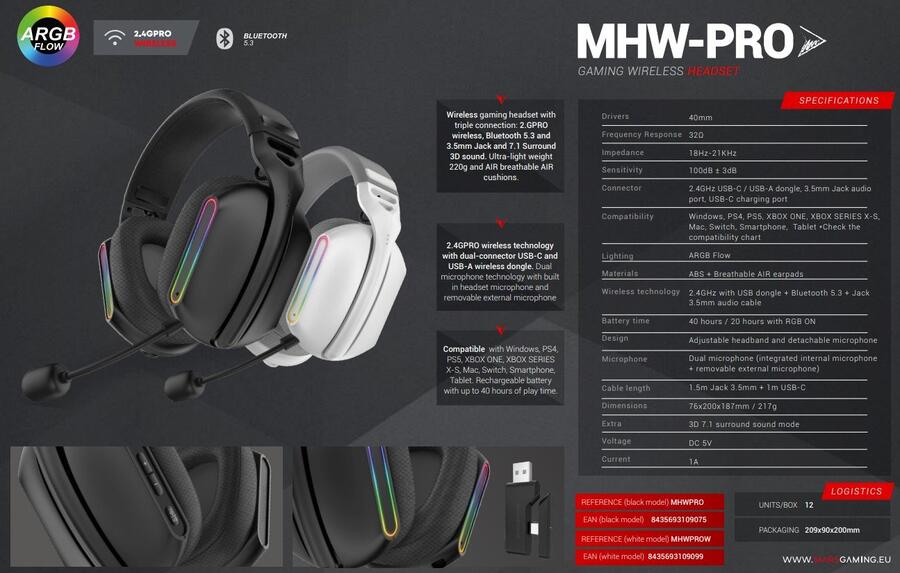 Mars Gaming MHWPRO Bezvadu spēļu austiņas 7.1 / Bluetooth 5.3 + 2.4GHz / Multiplatform