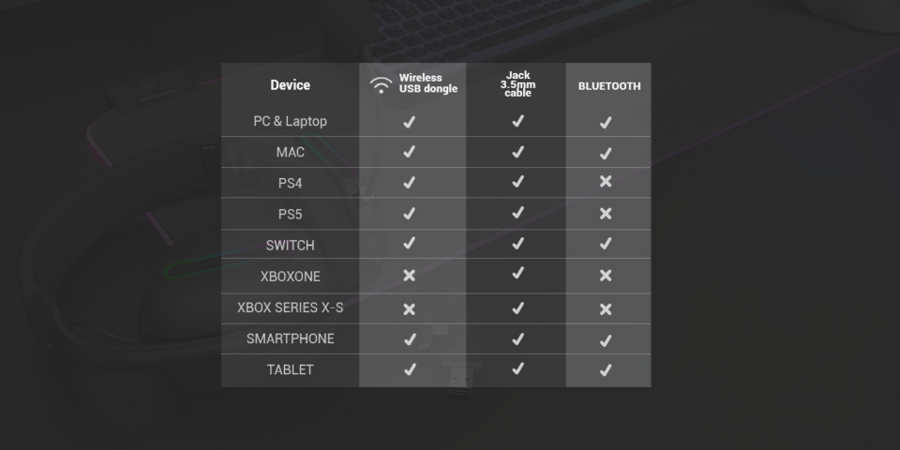 - Trīs režīmu savienojamība: Bluetooth 5.3, 2.4GHz un 3.5mm ligzda