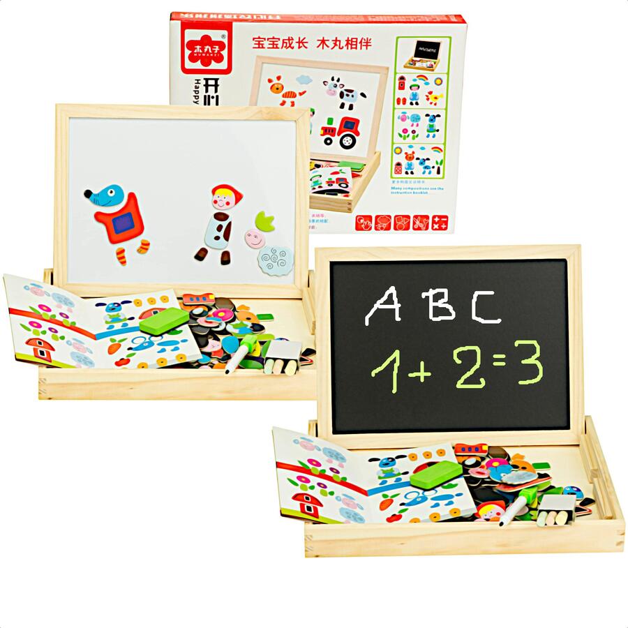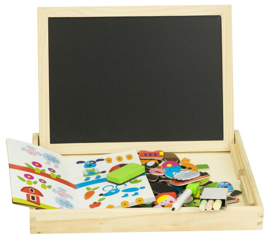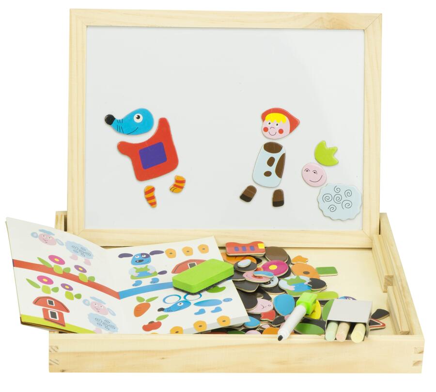 Divpusēja koka tāfele ar magnētiskām mīklām attēlu sakārtošanai.