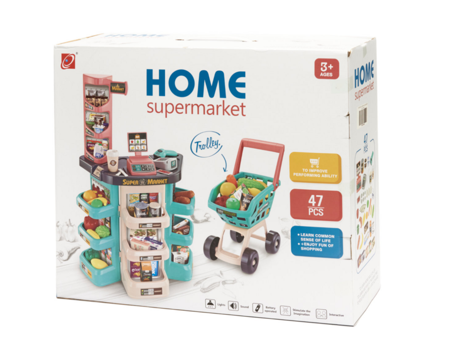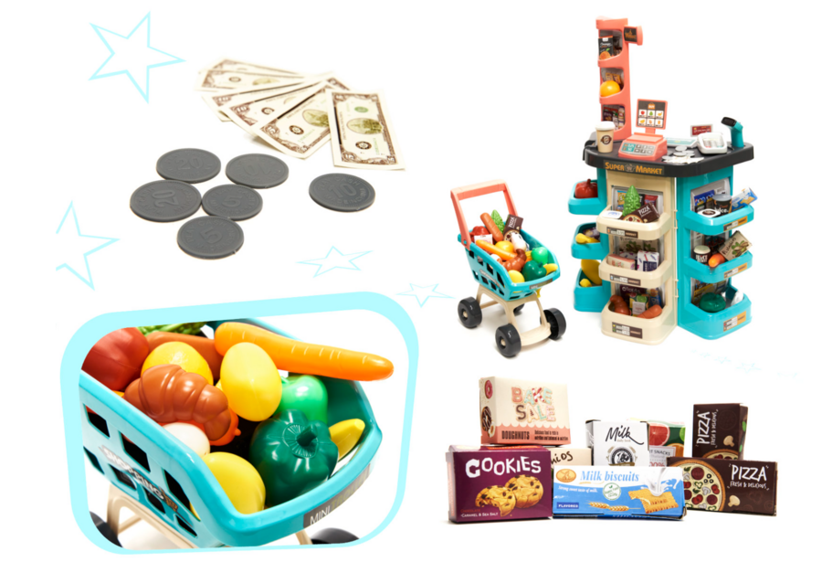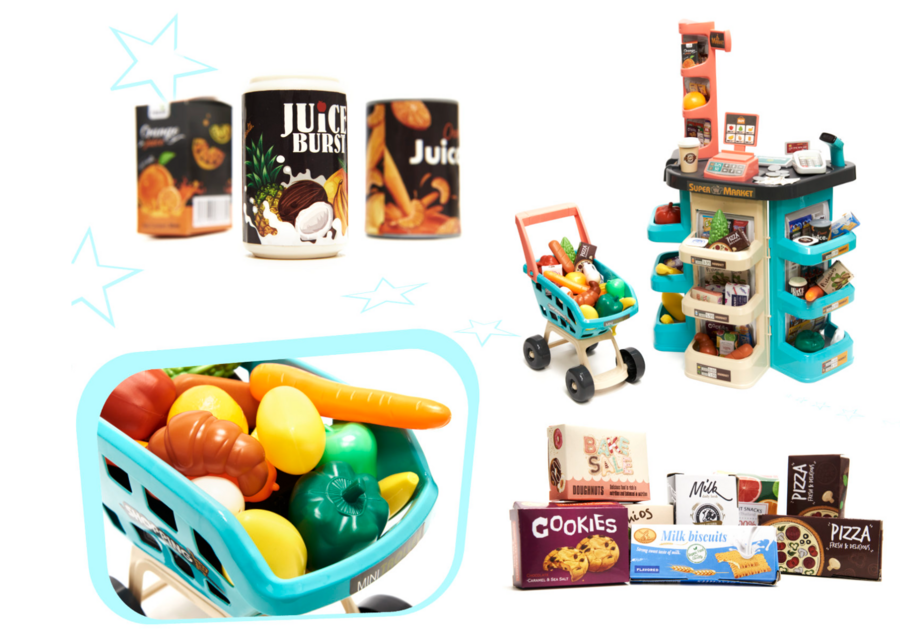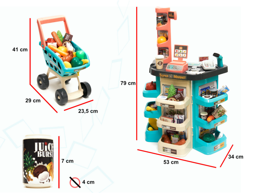 Komplektā atradīsiet visus nepieciešamos elementus, lai izveidotu īstu pārtikas preču veikalu.