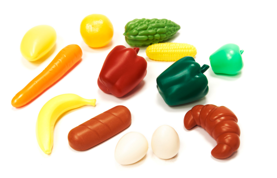 Starp 47 elementiem atradīsiet plastmasas augļus, dārzeņus, olas un kartona kastes, kas imitē cepumu, sulas, konfekšu vai picas iepakojumus.